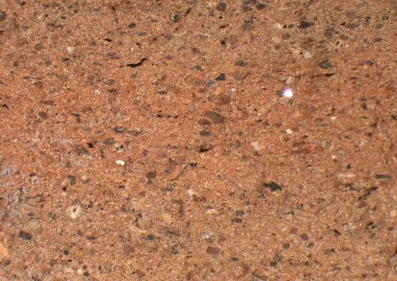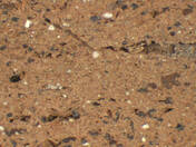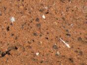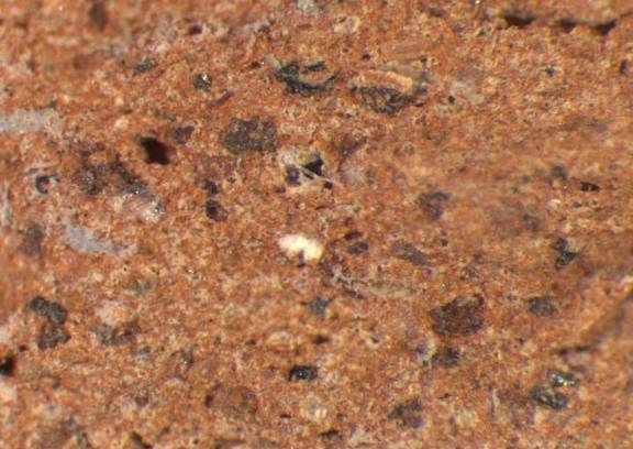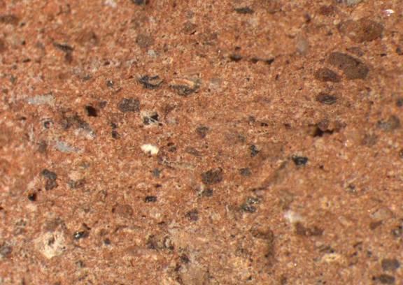 light brown, core: light reddish brown, granular; some large black particles, few medium-sized white inclusions |