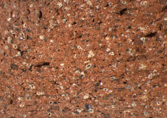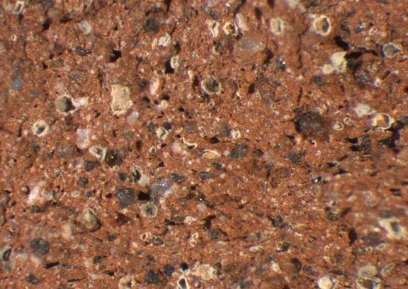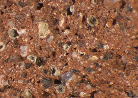 reddish brown, granular, numerous small to large white inclusions, medium-sized to large black and some large red particles |