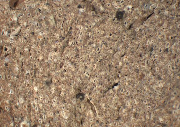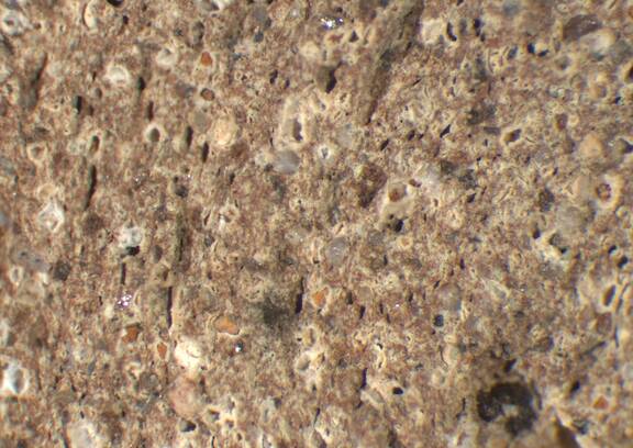 pink, irregular, riddled with fine to large white inclusions, some large dark brown particles, sporadic very large reddish brown inclusions |