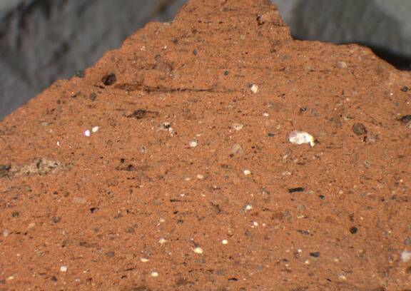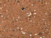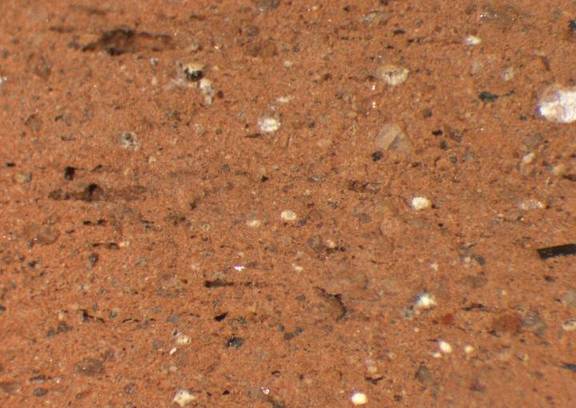 reddish brown, granular; numerous fine to medium-sized white particles, some medium-sized to very large dark brown inclusions |