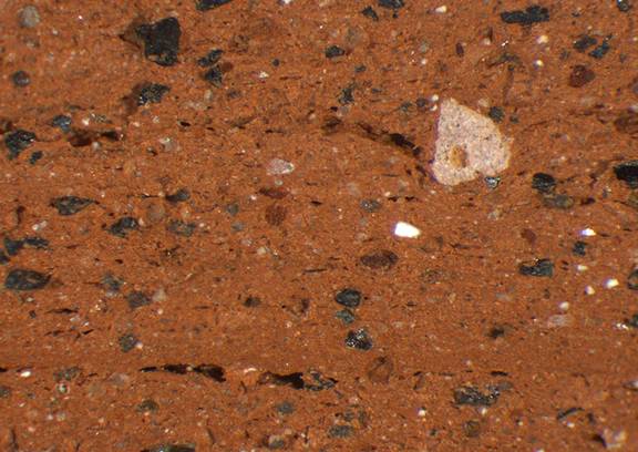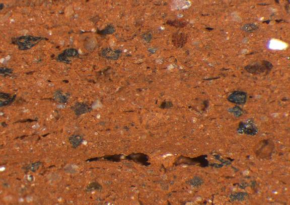 red, iregular; numerous white and black particles, mica |
