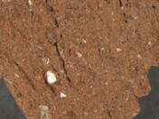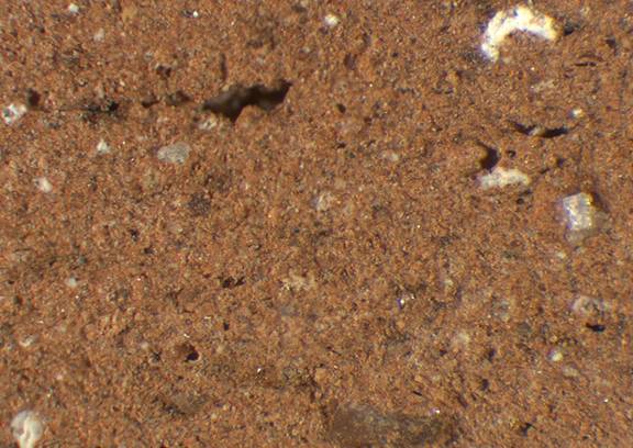 reddish yellow, granular; numerous fine, few large white inclusions, some large dark brown inclusions |