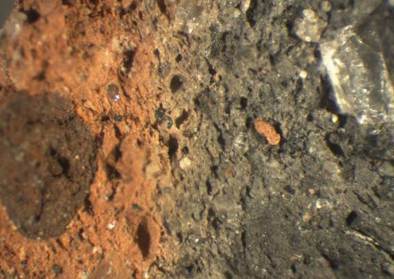 colour reddish yellow, core dark grey, texture coarse, numerous fine to large inclusions: clear, white, grey, black, reddish brown, mica, voids |