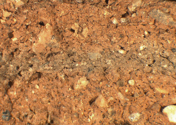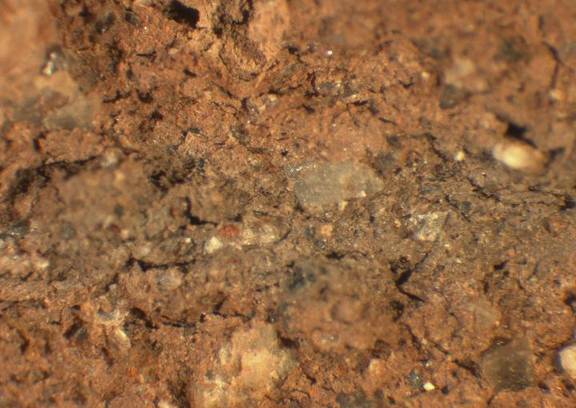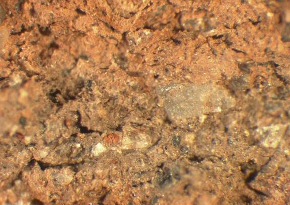 colour reddish brown, core reddish grey, texture coarse, numerous fine to large inclusions:clear, black, white, reddish, mica, voids |