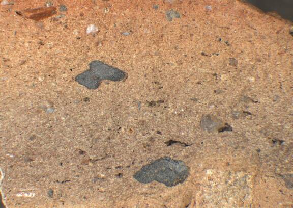 exterior: reddish yellow, fading to pink and pinkish gray, granular; mid-sized reddish brown particles, some very large dark gray inclusions |