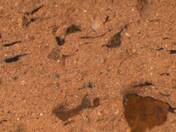reddish yellow, irregular; some large to very large yellowish white inclusions, some mid-sized dark particles |