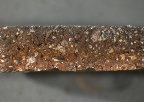 interior: light reddish brown, exterior: gray, irregular; numerous fine to mid-sized white inclusions |