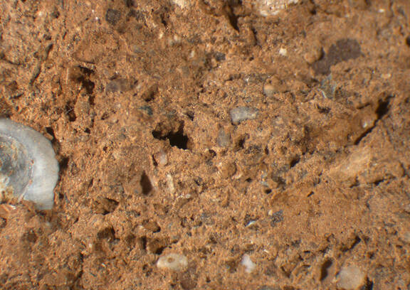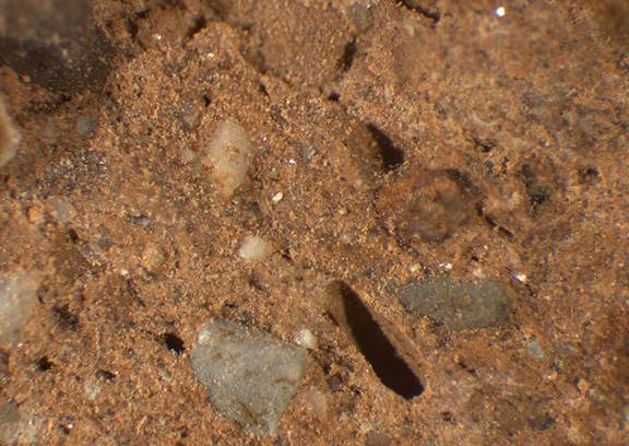 light brown, irregular; numerous mid-sized to large dark brown and gray and white inclusions |