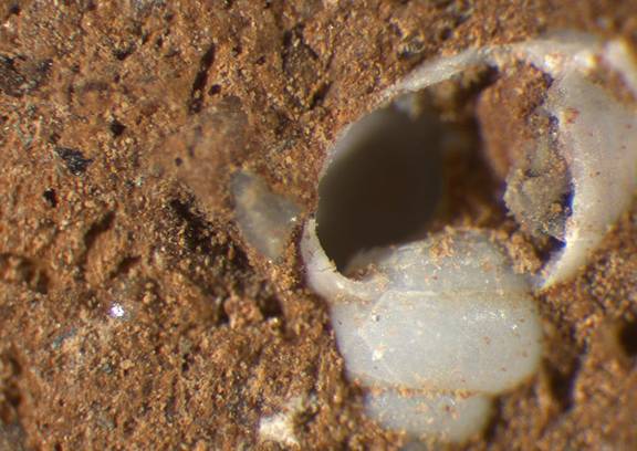 very frequent, angular, spherical, white, 0.04-0.8 |