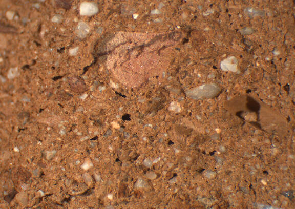 reddish brown, irregular; medium-sized red and gray inclusions, some mica |