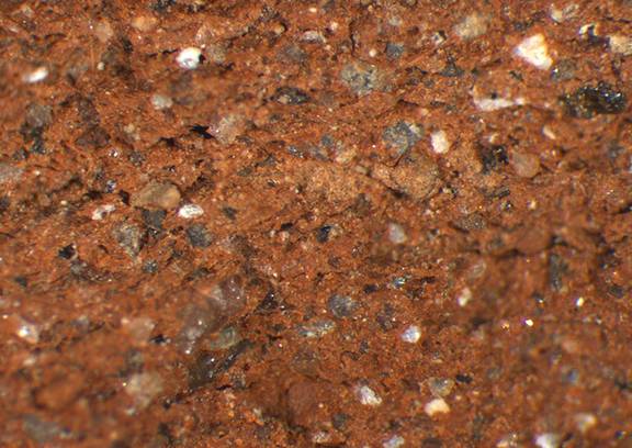 dark reddish gray, granular; numerous white and some dark inclusions |