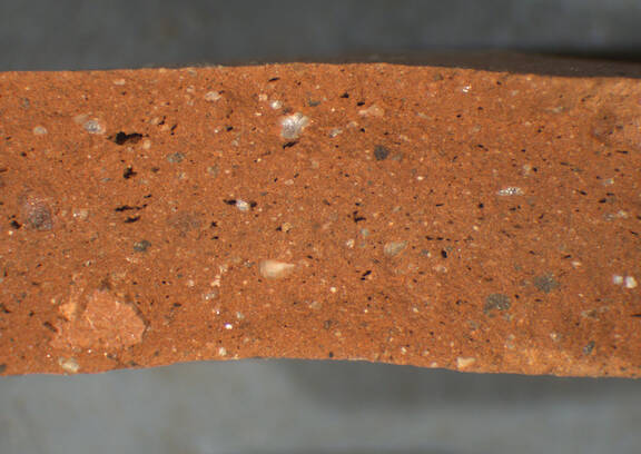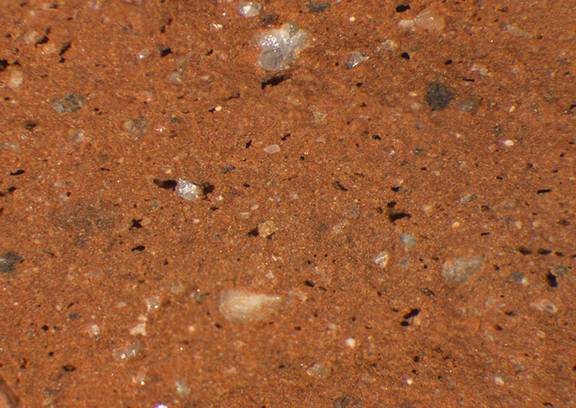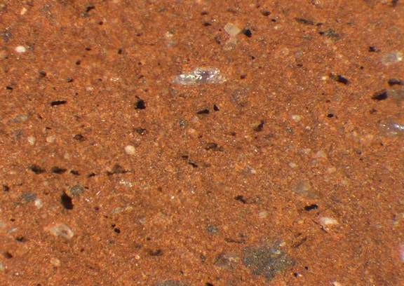 reddish yellow, smooth; some fine to large white and small dark inclusions |