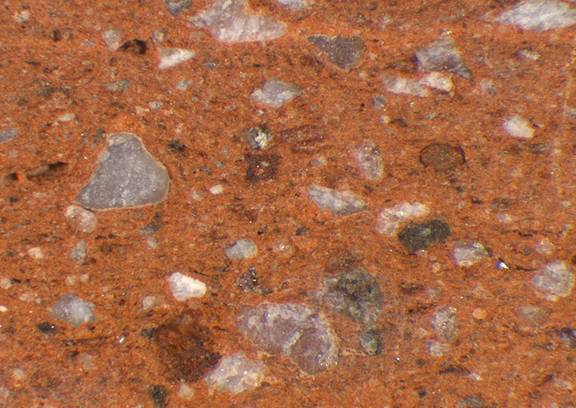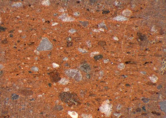 red; numerous fine, few large white inclusions (quartz), few fine to large reddish brown and dark brown inclusions |