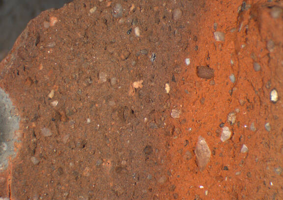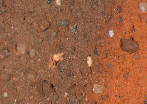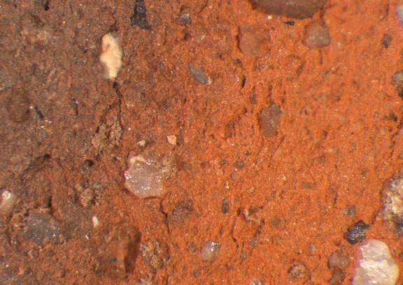 red, granular; numerous white, brown and black inclusions |