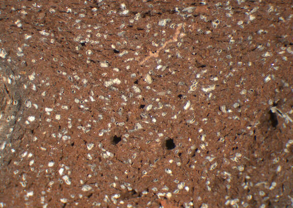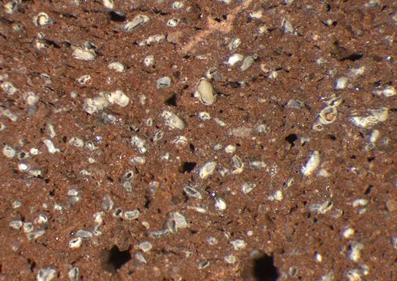 reddish brown and grey, granular; numerous fine to medium-sized white particles, some medium-sized to large dark brown inclusions |