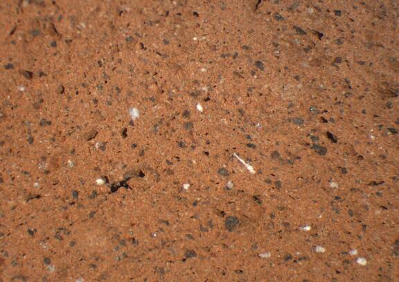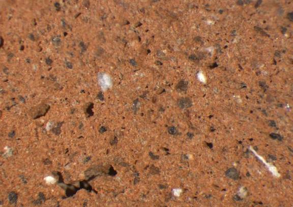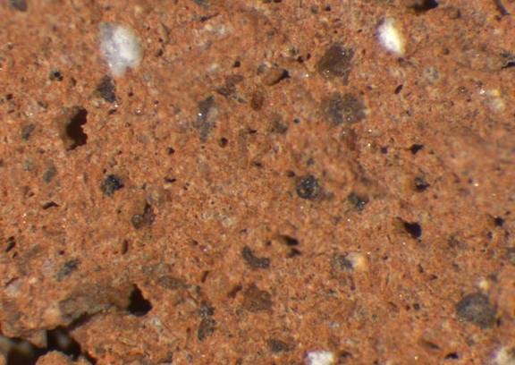 reddish yellow; granular; some fine dark inclusions, few fine to medium-sized white particles |