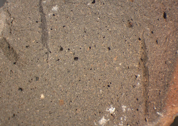 colour grey, edges red, texture fine and compact, few medium sized inclusions: white, grey, red, voids, mica |