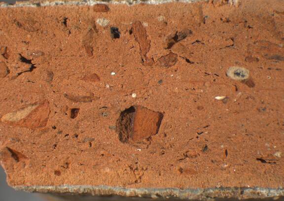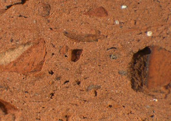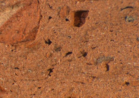 reddish yellow, granular, some large dark brown and mid-sized white inclusions |