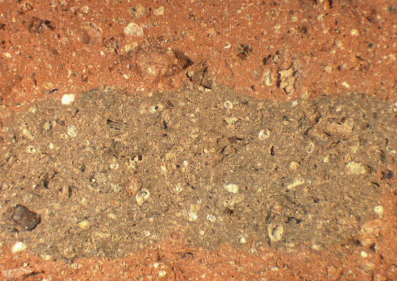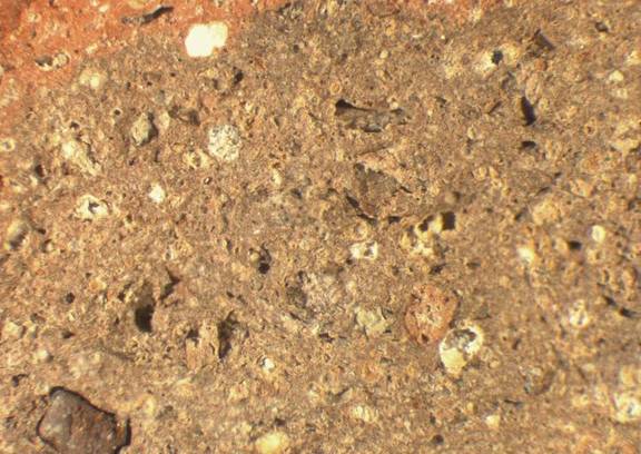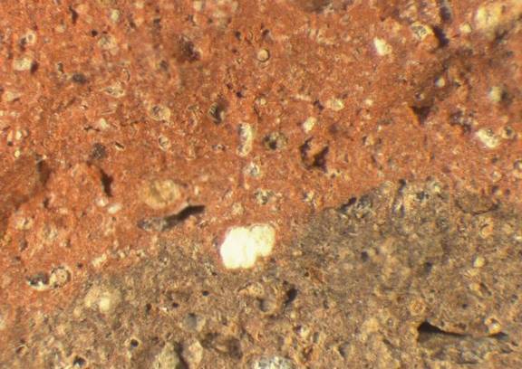colour red, core grey, texture coarse and compact, numerous fine to large inclusions: yellowish, white, red, grey, voids |