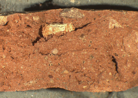 colour red, texture middle fine, numerous fine to large inclusions: white, grey, red, voids |