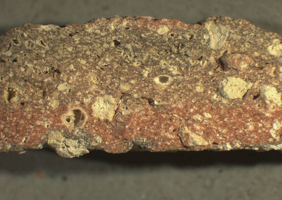 colour exterior and interior light red, core brownish grey, texture coarse, numerous fine to large inclusions: white, yellowish, red, pseudomorphoses, voids |