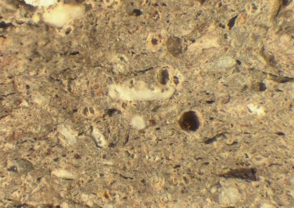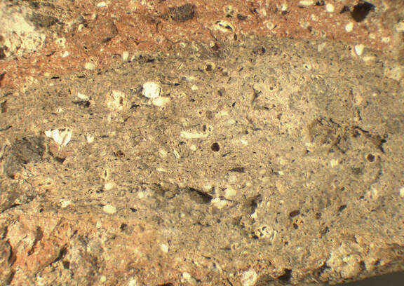 colour light red, core light brownish grey, texture coarse, numerous fine to large inclusions: white, grey, red, voids |