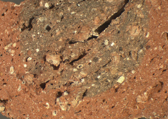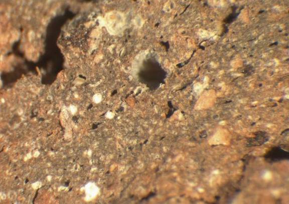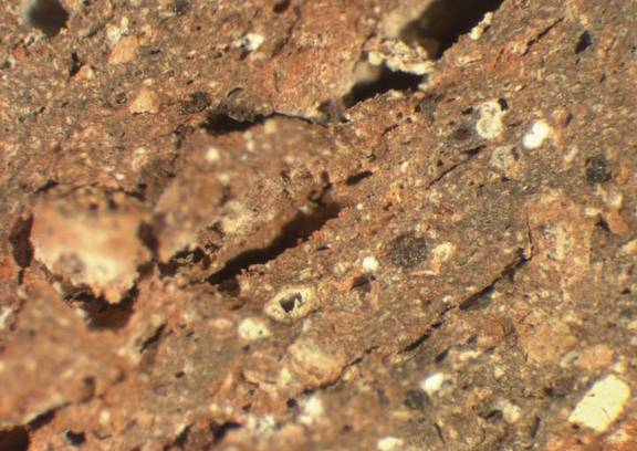 colour light red, core reddish grey, texture coarse, numerous fine to large inclusions: white, grey, voids |