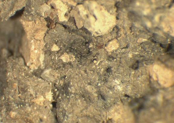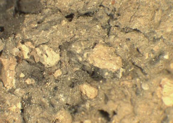 colour light reddish brown, core dark grey, texture very coarse, numerous fine to large inclusions: yellowish, reddish, black, voids |
