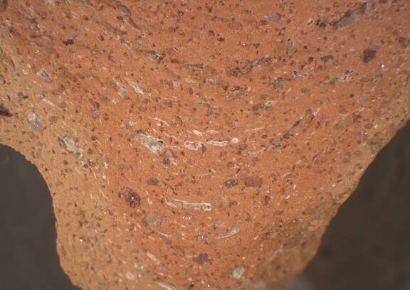 colour pale orange, core light red, texture medium and compact, numerous small to large inclusions: white, red, voids |