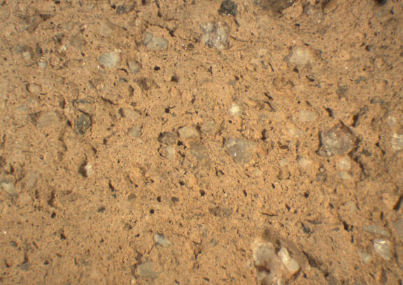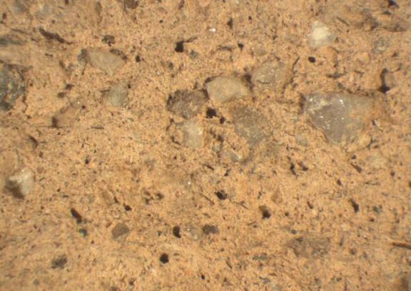 colour very pale brown, texture middle fine, numerous fine and few large inclusions: grey, white, red, mica, voids |