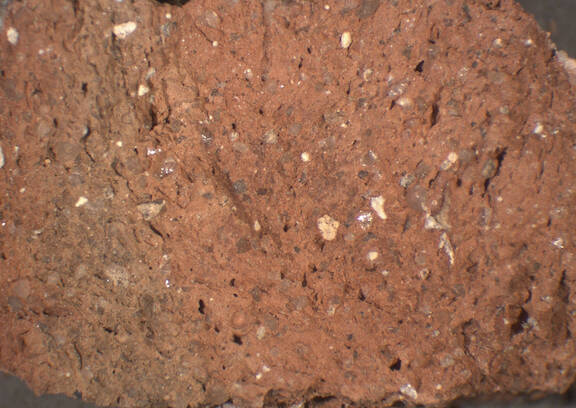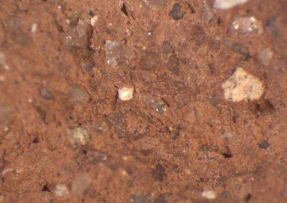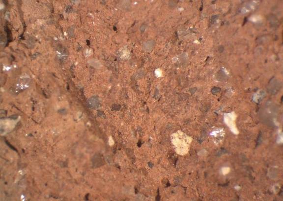 colour light red, core light brown, texture middle fine and compact, numerous small to large inclusions: white, grey, mica, voids |