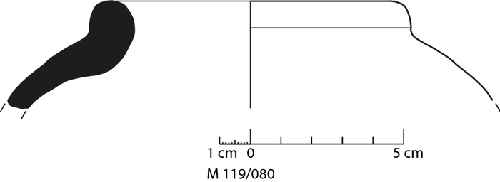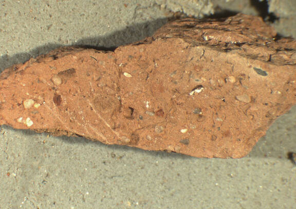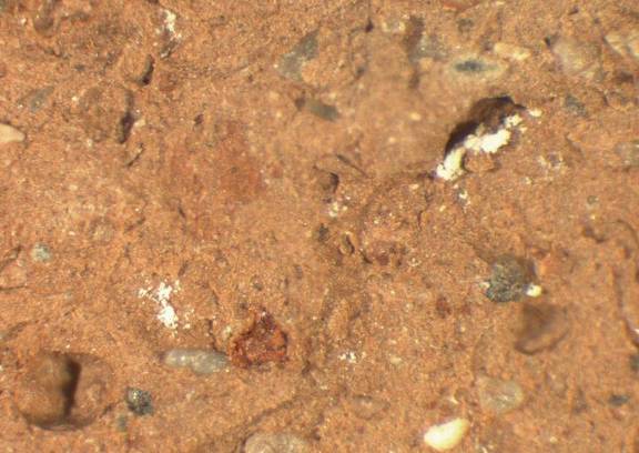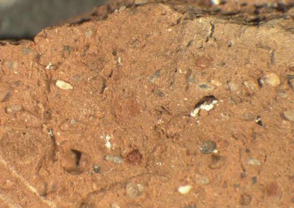 colour reddish brown, texture middle fine and compact, numerous large inclusions: white, yellowish, grey, red, mica |