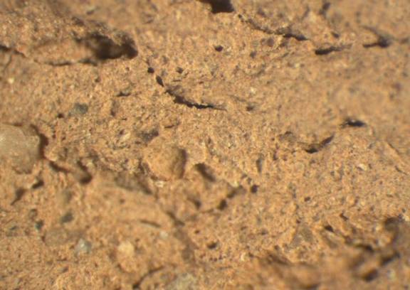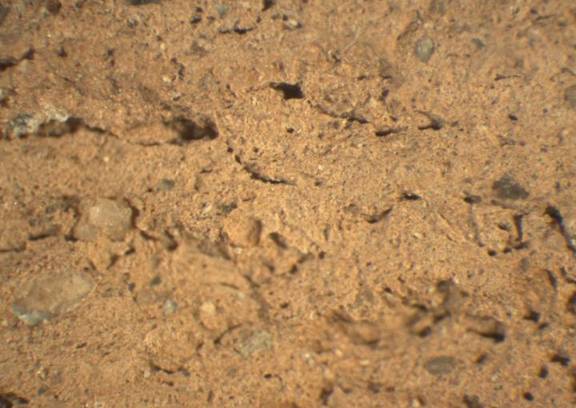 | visual examination of fresh break | colour light red, texture coarse, numerous fine to large inclusions: grey, mica, voids |