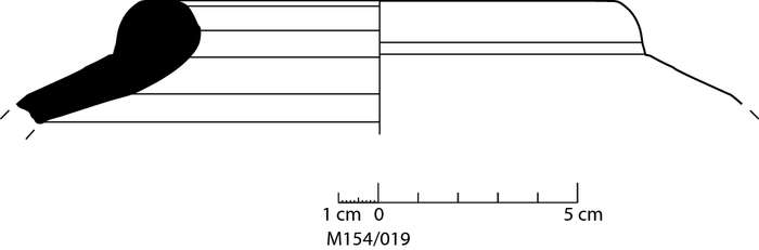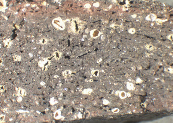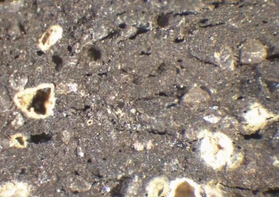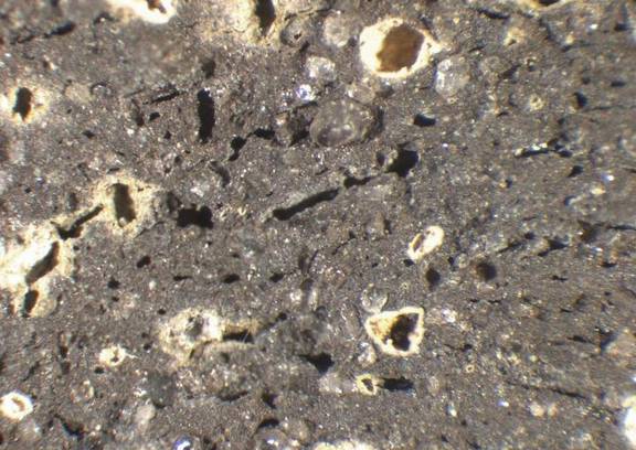 colour dark grey, peripheral areas brownish red, texture coarse, numerous small to large inclusions: yellowish white, white, voids |