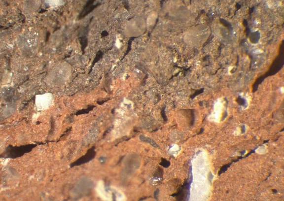 colour red, core brown, coarse texture, numerous small to large inclusions: white, voids |