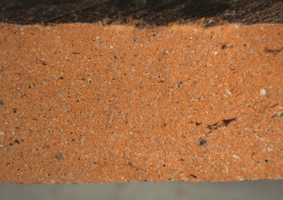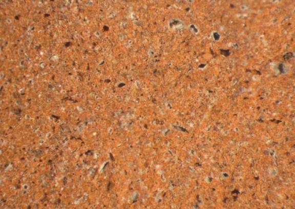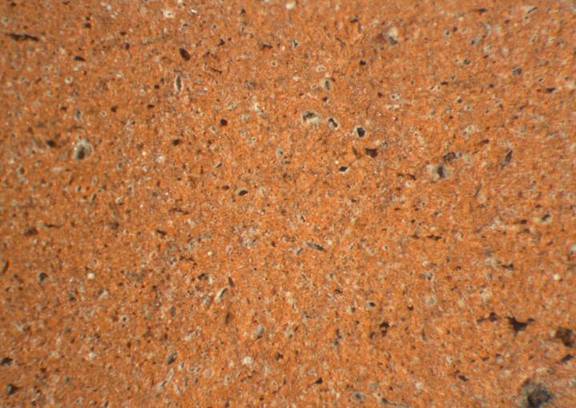 | visual examination of fresh break | colour red, texture fine and compact, numerous small inclusions: white, grey, voids, mica |