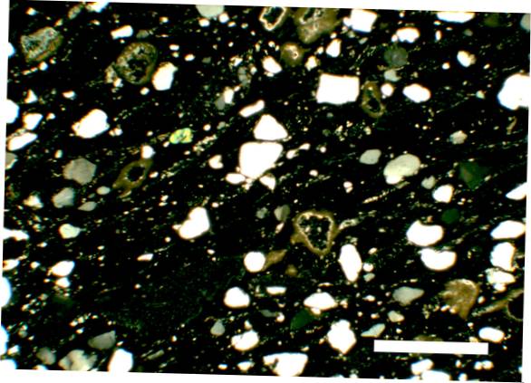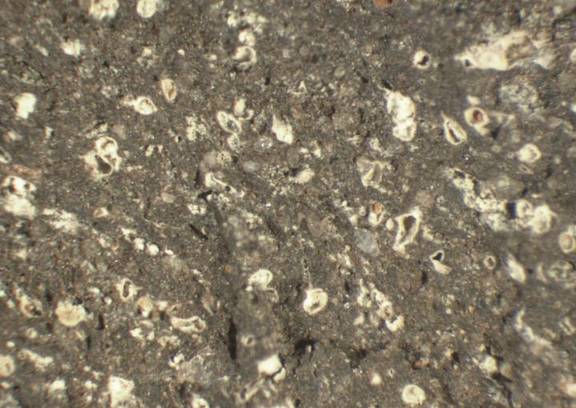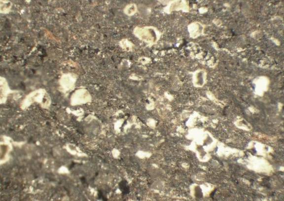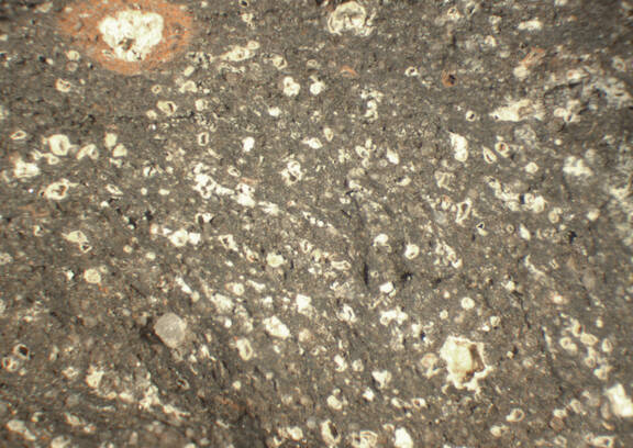 colour greyish brown, coarse texture, numerous small to large inclusions: white, yellowish white, red, voids |