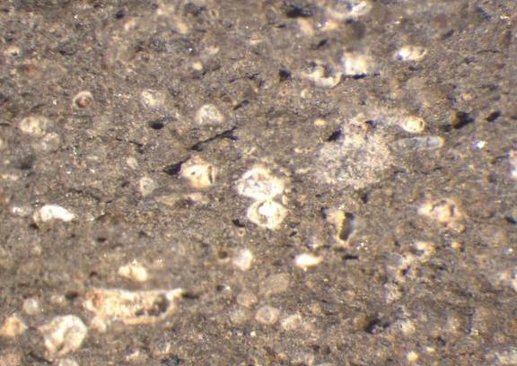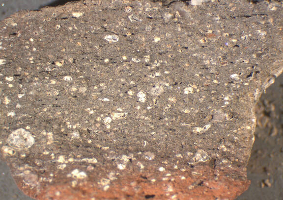 colour grey, peripheral area red, coarse texture, numerous small to large inclusions: white, grey, red, voids |