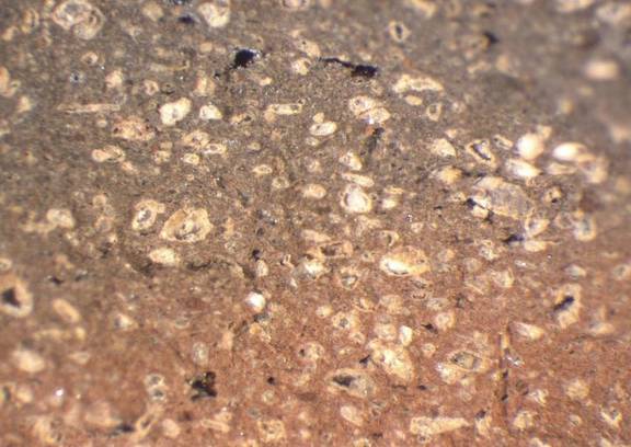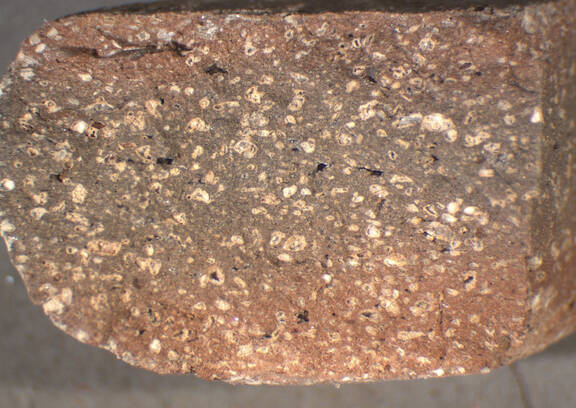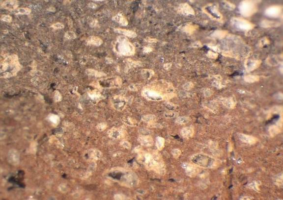 coulor red, core grey, coarse texture, numerous small to large inclusions: yellowish white, red, voids |