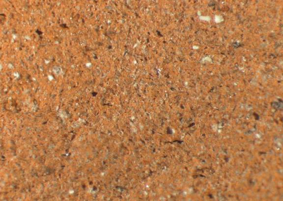 | visual examination of fresh break | colour light red, texture fine and compact, numerous small inclusions: white, grey, voids, mica |