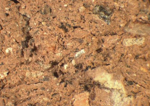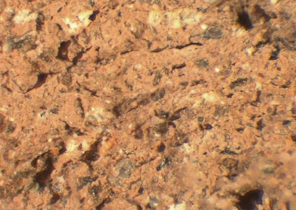 colour light reddish brown, texture coarse, numerous fine to large inclusions: white, black, grey, red, mica, voids |