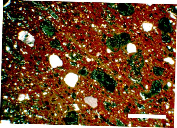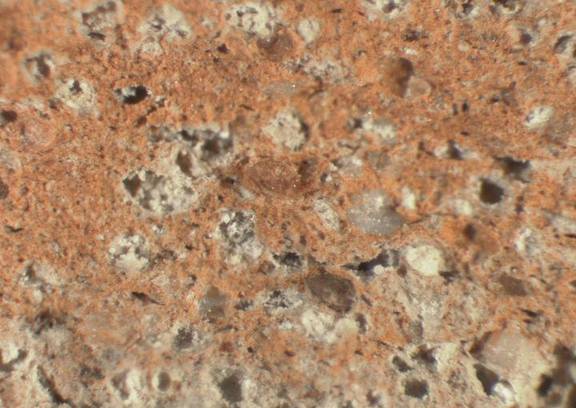 colour light red and pale brown (sandwich), texture middle fine, numerous small to large inclusions: white, grey, red, voids |