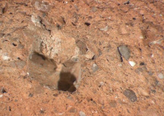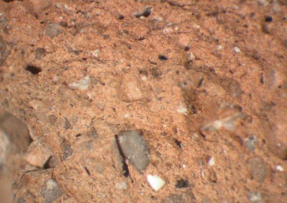 colour light red, core light brown, texture middle fine, numerous small to large inclusions: white, grey, red, mica, voids |
