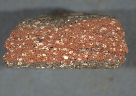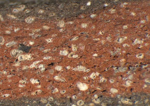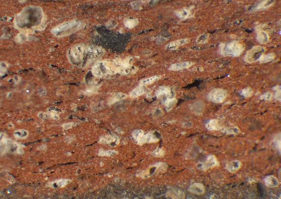 light red, irregular; numerous fine to large white inclusions, some dark inclusions |