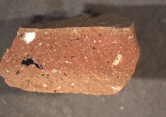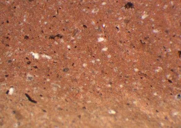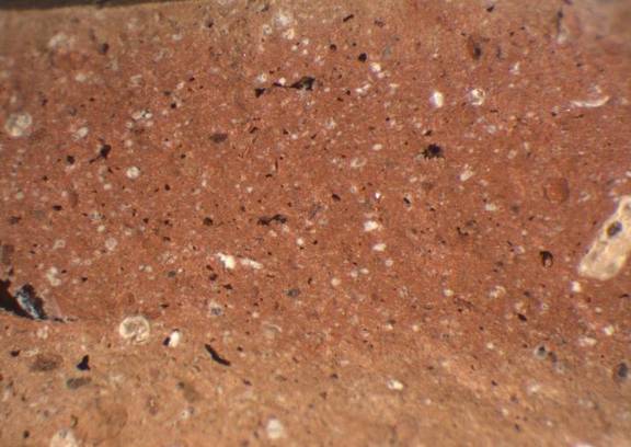 colour light red, edges light brown, textur fine and compact, numerous small and some lage inclusions: white, red, voids |