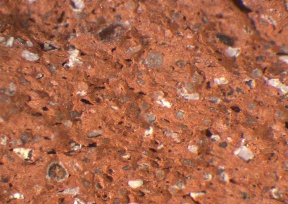 colour red , texture middle-fine and compact, numerous small and some large inclusions: white, grey, red, voids |