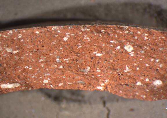 colour red, texture middle-fine and compact, numerous small to large inclusions: white |