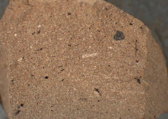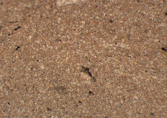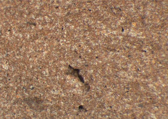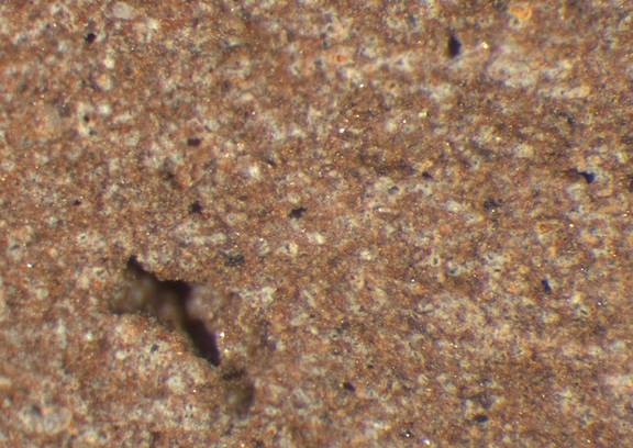 brown, granular; some large red and black inclusions |