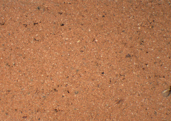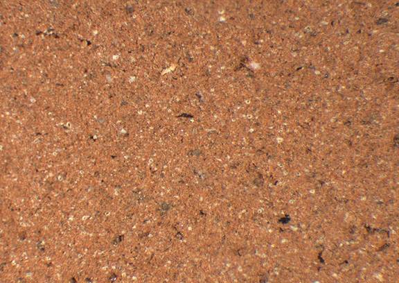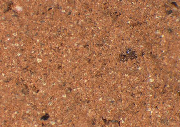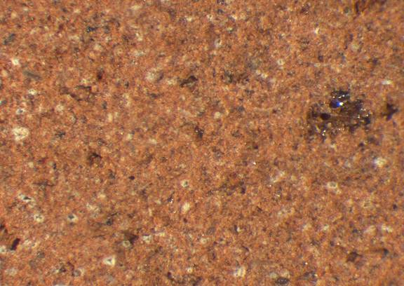 reddish yellow, granular; scattered fine to mid-sized black inclusions |