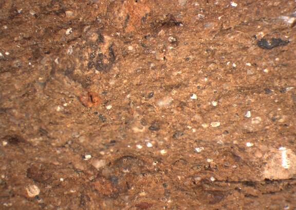 dark yellowish brown, irregular fracture; numerous fine white and dark inclusions, singular large brown particle |